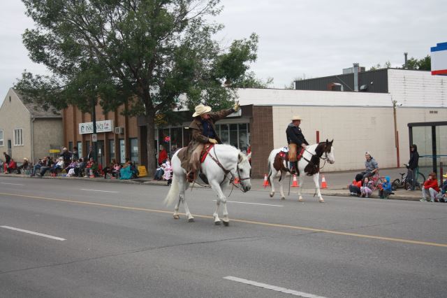 "Lethbridge Whoop-Up Days parade. Cathy riding Mighty Blue N True and Bill West riding Painted Pepolena" |