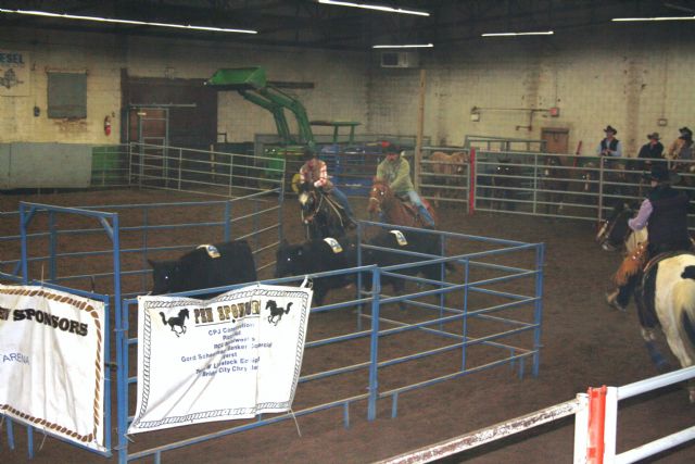 "Jake Daniels, riding Shesa Frosty Nic, Kim Lais, and Kim Daniels, riding Keotas Fast Cash, putting 3 in the pen." |