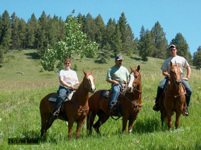 Trail riding in the Porcupine foothills. Horses from left to right are Gone To Arizona, Little Jewel Cat, and Skipper Gillette.