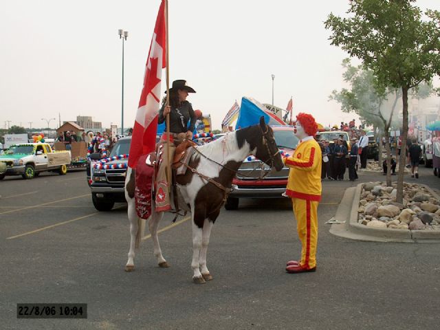 "Miss Rodeo Canada riding Keotas Fast Cash talking with Ronald McDonald at the Whoop-Up Days Parade" |