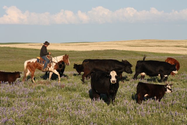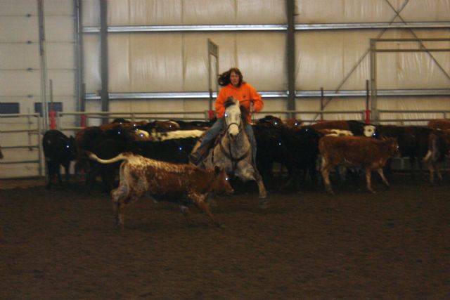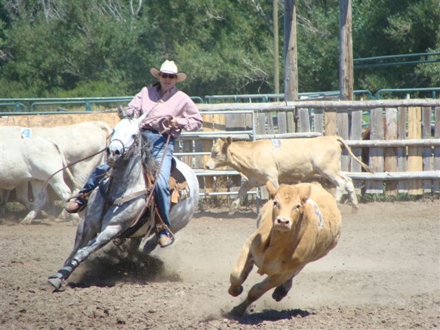 "Cathy and Mighty Blue N True (George) after a cow. Picture taken by Amy Rombough" |