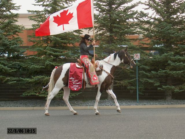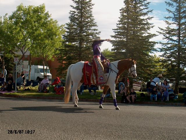 "Miss Rodeo Canada leading the Whoop-Up Days parade aboard Blue Eyed Storm" |