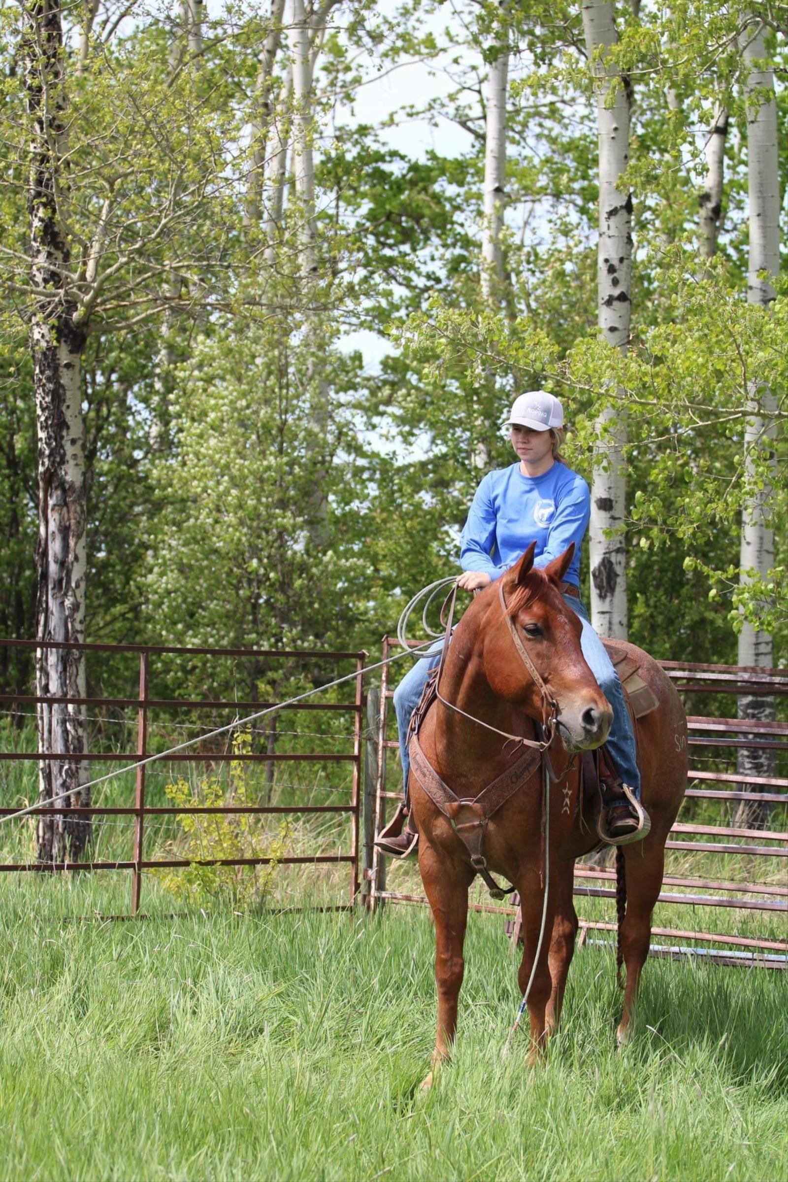 Spade is a 6 year old gelding that stands 15.3 hands tall. He is a true all around honest horse, head, heel, breakaway, and ranch horse. He is seasoned in both the heading and heeling, getting hauled to the World Series and jackpots in Arizona and Alberta. He is great in the box, stands, scores and leaves off your hand. In the heading he runs to the same spot every time and rates off with lots of pull and a quick face. In the heeling he will be there on the corner and is a push style really hunting the stop and can take the hit and not come out of it. He's been ranched on extensively and is our go to horse for doctoring, brandings or gathering. In the breakaway he has been my practice horse for a couple of years, he is easy to rope off considering his size, point him to the pin and he will stop off your seat. I have had Spade since he was a yearling. I have watched him grow up and he hasn't taken a wrong step and he has also never been unsound or hurt. He is the most honest and safe horse I have. He knows his job and is happy to do it everyday or give him a long break, he will be the same every time. He will take care of a junior or senior roper, a green rider or be competitive in the higher numbers. He hauls great by himself, he is built to last and guaranteed to turn heads. I am very proud to offer Spade and loved having him. Come and try him out! He is located in Ponoka. For more information contact Brooke at 780-621-0714.