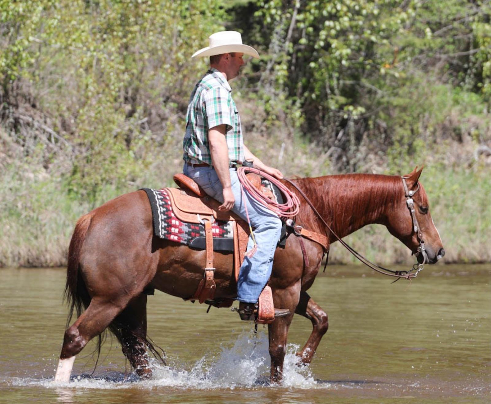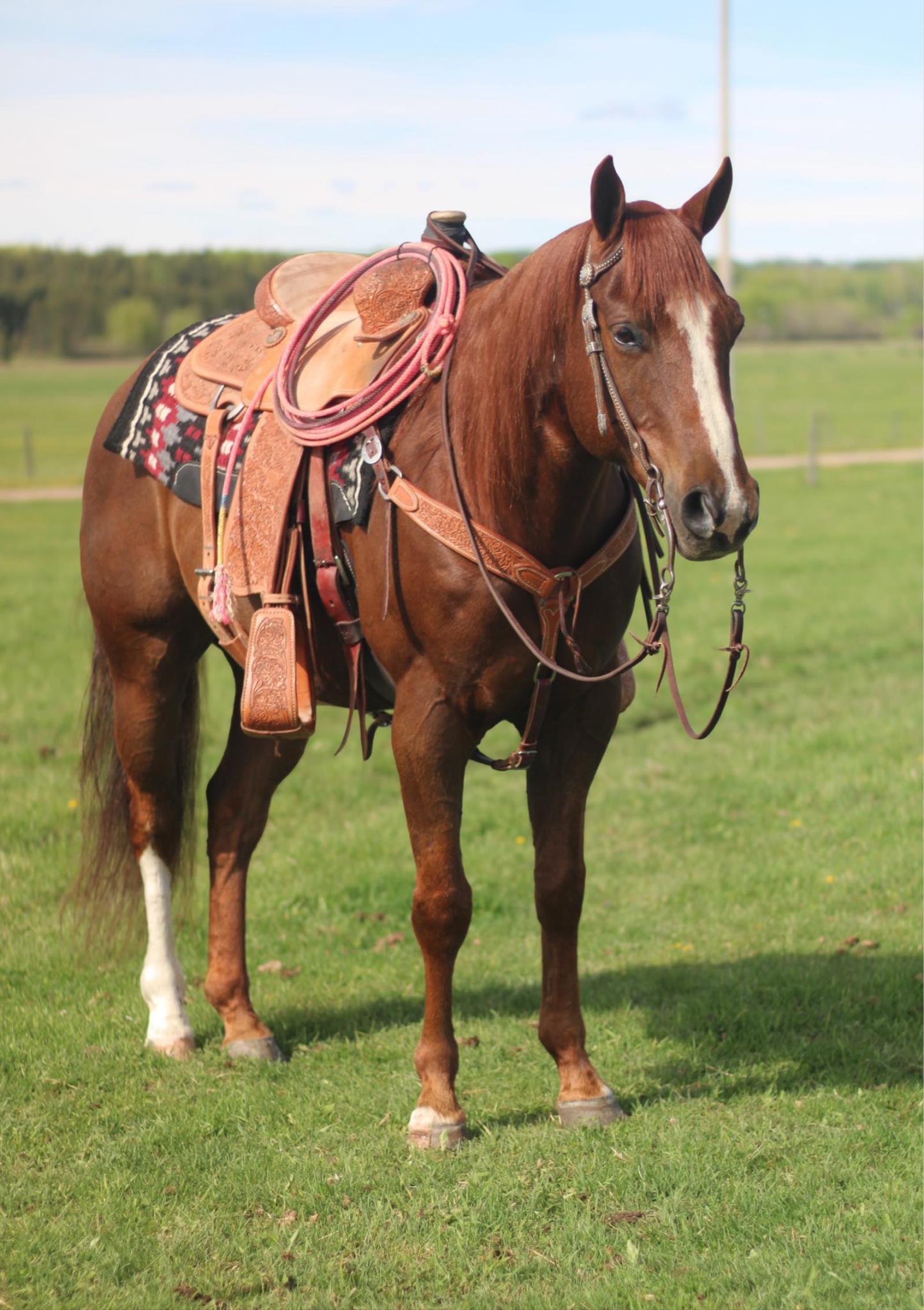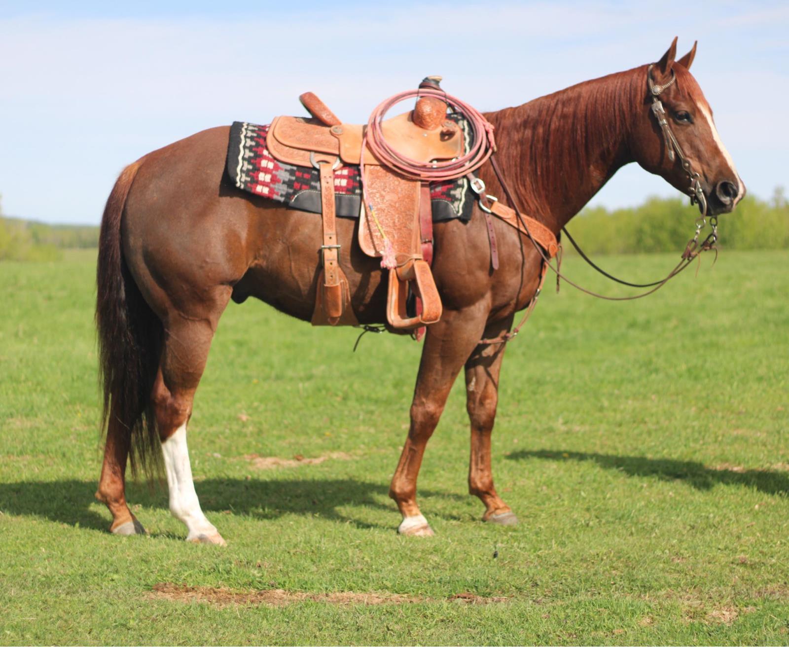 Chelada is a stout chestnut gelding, with some chrome to go with him. He is 7 years old, stands 15hh and weighs 1200lbs. He is a deluxe ranch horse and is the one you want to saddle if you need to get the job done on the ranch. He knows all about a long days work. We have used him in the feedlot, gathering cattle in rough terrain, doctoring yearlings, dragging calves and to sort pairs. Take him straight from the pasture to the arena and back him in the box. We have been heeling on him mostly, but he is also a head horse. He leaves the box flat and smooth, really watches a cow, makes a nice corner and gives you that same consistent throw every time. He is great on the trails and will go where you point him. This gelding will be enjoyable to own everyday. If you are looking for a rope horse and one you can use on the ranch, this is the gelding for you. For more information please call Kale and Tatum Peterson at 780-515-0715.