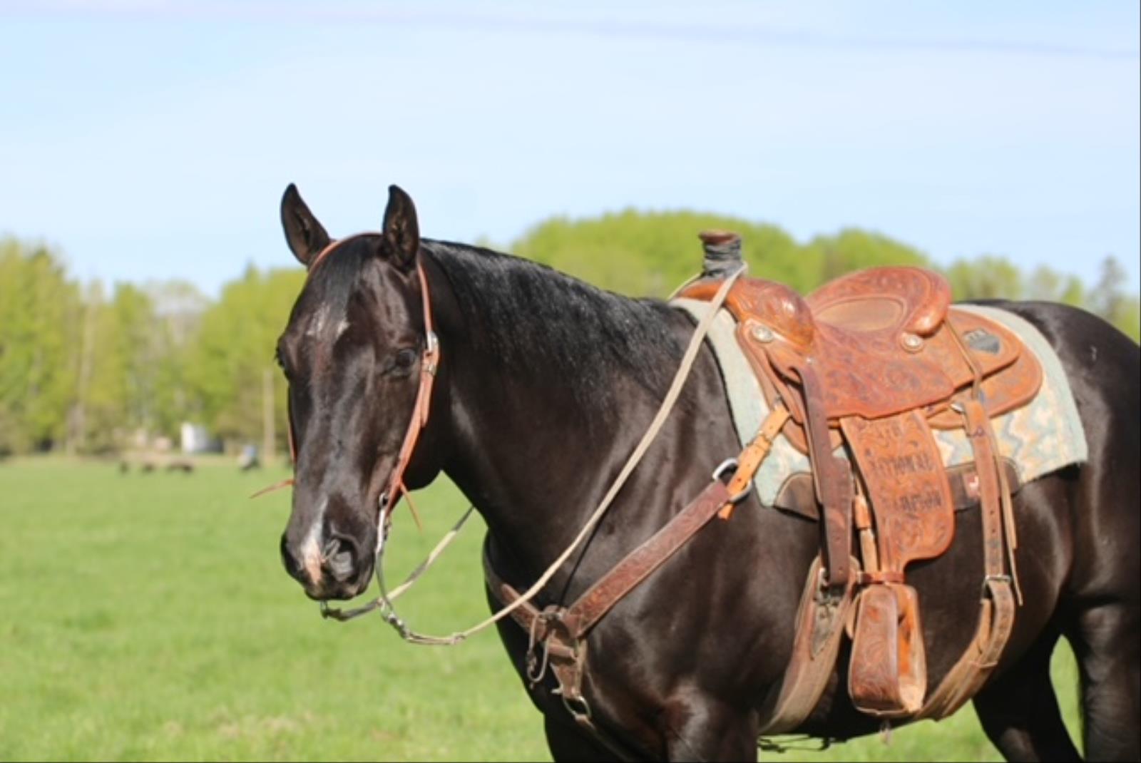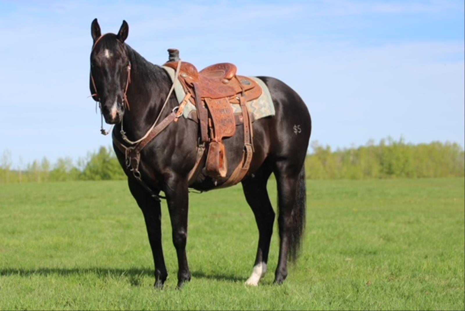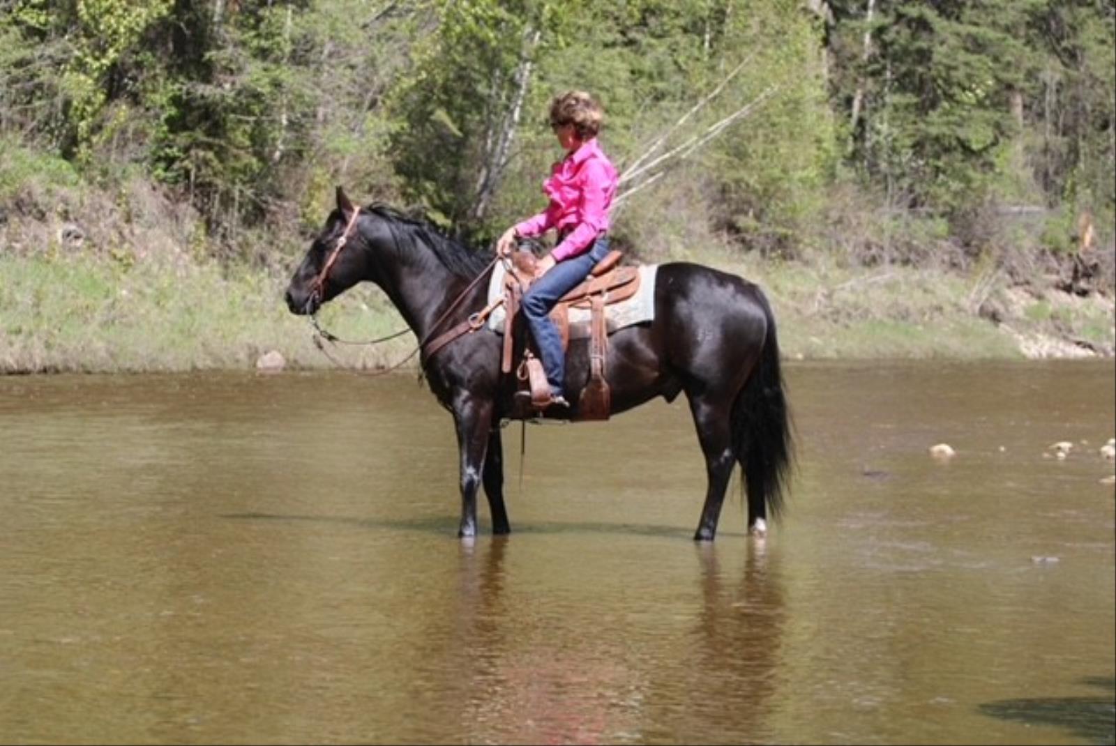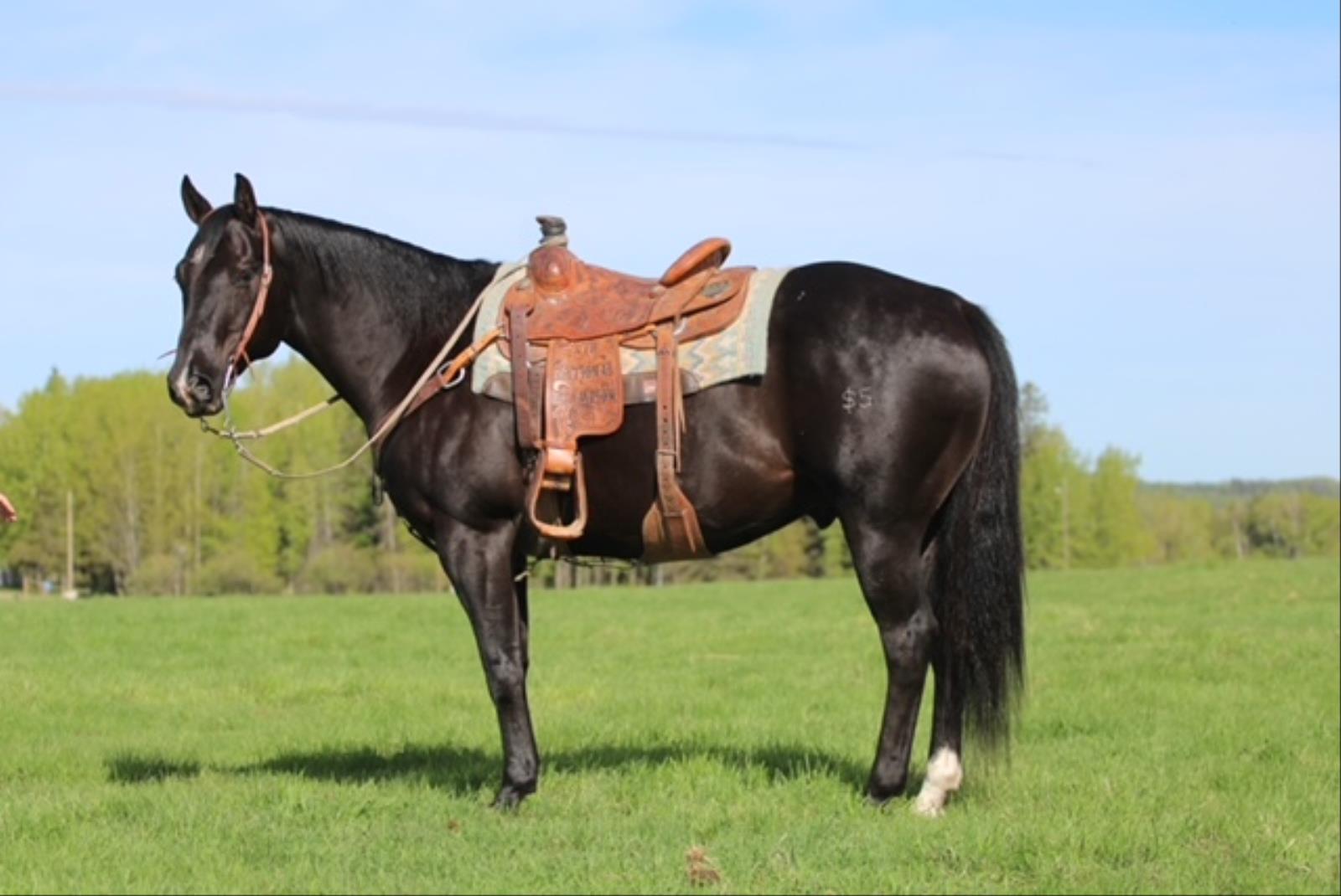 Check out this flashy black 10 year old gelding! Pistol stands that perfect 15.0HH and weighs about 1200lbs. Pistol is a seasoned head and heel horse that has been to rodeos and jackpots. He has been through the barrier and has seen all the sites and sounds. He is great in the box, scores good, leaves flat and gives that great position to throw. He knows his job and will take you to the pay window. He is easy to rope on and will suit many levels of ropers. Aside from being a great rope horse he has also been used on the ranch doctoring yearlings and dragging calves at branding time. Pistol is one you want to come and check out! For more information call Rory Patten at 780-542-0643.