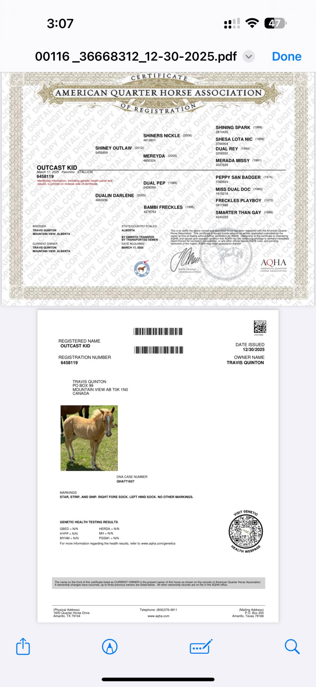 2025 PALOMINO COLT Sired by Shiney Outlaw out of Dualin Darlene by Dual Pep 6 Panel N/N Here's one to consider as you next roping prospect. Full Brother to Macie Warken's bay gelding that she won the 2024 Royal Crown 4yr and under Breakaway on and most recently the 2025 Fall Classic Rope Horse Futurity 4yr old Breakaway. You can probably imagine where this colt may excel in. But, is bred to go in may different ways from the cutting, cowhorse, roping and ranch riding. Dualin Darlene is a Producer of $110,000+ (Edit now $140,000 as of Jan5/26) in NCHA, NRCHA, 2024 Royal Crown Breakaway 4 & under Champion and most recently 2025 Fall Classic Rope Horse Futurity 4yr old Breakaway Champion with Macie Warken. Her foals are quick footed, smart, athletic, strong and have a willingness to learn. This mare is set up to be a producer with other great foals by top sires coming down the line. Two of her colts stand to the public.