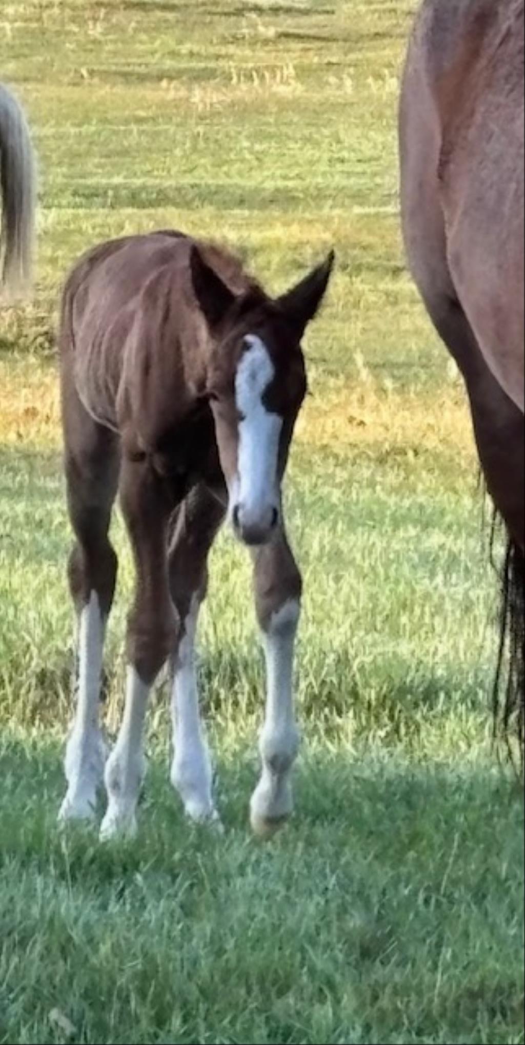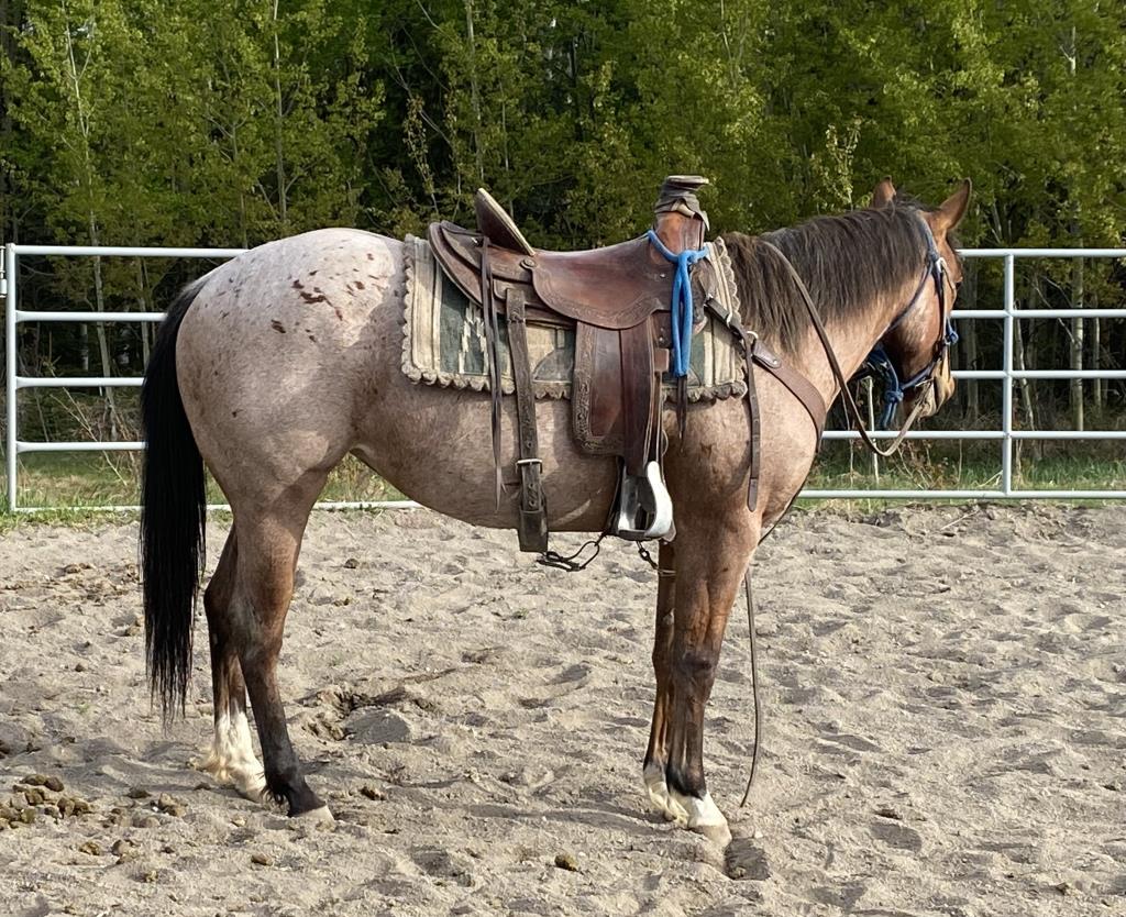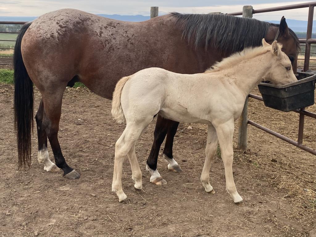 BAY ROAN 6 YEAR OLD MARE - VET CHECKED IN FOAL FOR 2026 BRED TO WIMPYS ROYAL KING ( pictures posted ) MONA IS 15 HANDS HER 2024 PAOLMINO STUD COLT BY WIMPYS ROYAL KING IS PICTURED SHE HAD GROUND WORK done & RODE ONLY A FEW TIMES AS A TWO YEAR OLD, HAS SINCE BEEN A BROOD MARE - NICE MINDED MARE " 6 Pannel N/N "