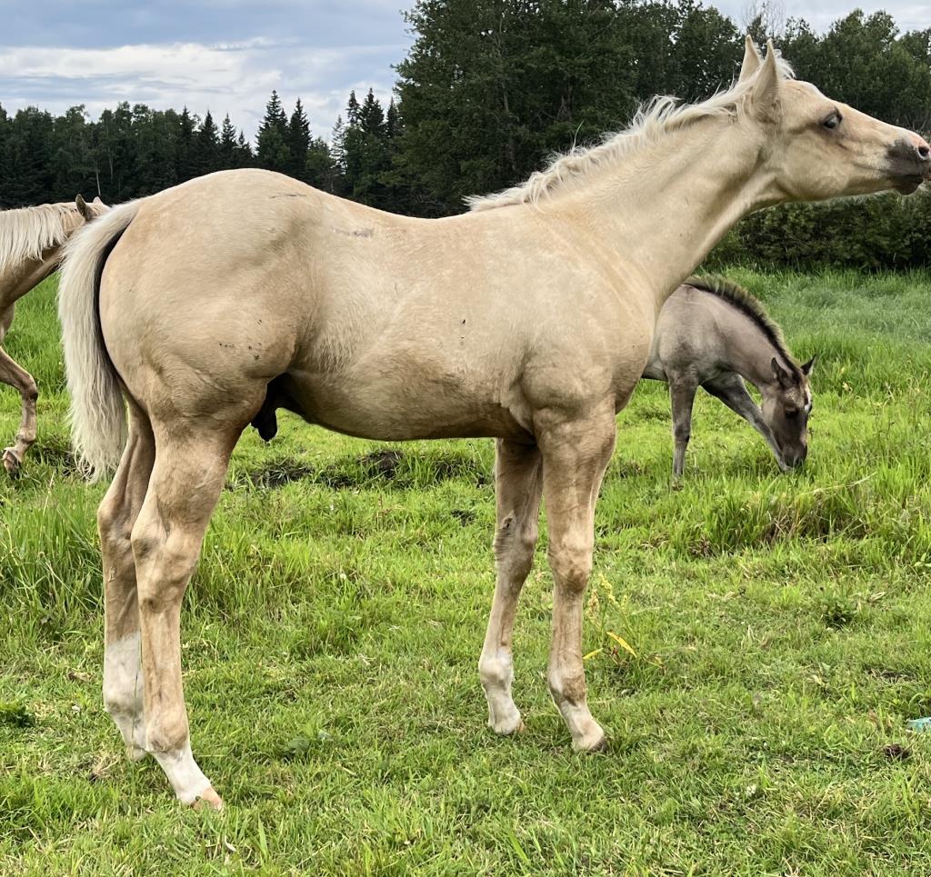 SILVER TRADITION, AKA Yogi is a stunning and amazingly sweet fellow. He's been a long time in the making as I purchased his frozen semen @20 years ago from 6666 ranch! Back then his stud fee was $1500 and now $2500 US. (Plus it would cost @$2000 in Fed ex charges to get frozen semen brought up). Yogi has incredible conformation and a real pretty head and a HUGE hip! He has very strong legs and great bone and movement. Yogi's sire passed away at a very young age but still managed to have a pretty impressive show and sire record ( 26 performing foals) such as DREAMY PLAYCAT ($18,361:2008 Calgary Stampede Cutting 3YR old open $ earner. CAT SILVER-$11,843 and 21.5 AQHA points. There have been very few CAT SILVER colts born in this last decade. ALOTTA CAT made it to the Road to the Horse in 2024. Yogi's dam was in professional training for WCH and was showing great promise but sadly had a career ending injury. She has such great temperament that she was used for an EAL horse- equine assisted learning therapy horse for a few years. Yogi is her first foal and we are so impressed that we bred her back the same. The dam is the old bulldog style and as pretty and kind as they come! Her dam was quite a cattle penner and has done very well at Calgary stampede pennings. Yogi-6 panel N/N except N/MY. Email rndcreek@gmail for more pictures. Website https://rndcreek.wixsite.com/roundcreek with lots of pictures of Cat Silver and Yogi. Excited and proud to offer this YELLOWSTONE colt to the public for the first time, as he was frozen in time and finally released.