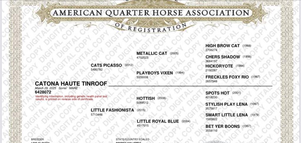 Catona Haute Tinroof 2025 filly by Cats Picasso x Little Fashionista (by Hottish) NCHA 3500 In BC