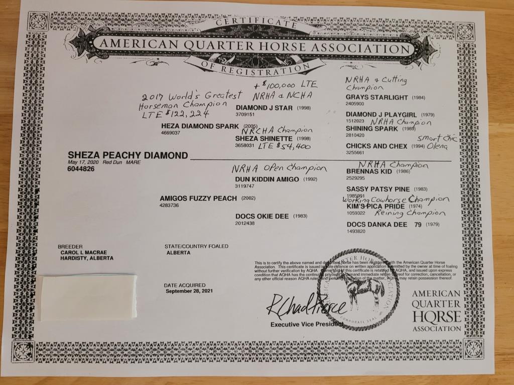 Sheza Peachy Diamond, 2020 Red Dun Mare, by 2017 World's Greatest Horseman Champion Heza Diamond Spark Peaches was started and is shown by a 70yr old first time Reinier, But now has had a year & half of professional training and has not yet reached her full potential with room to improve. Her papers are chalked full of Champions in both Reining and Cow Horse events. Entered primarily in entry level reining events but has managed 3 first places, and a couple of third and fourt places. With a more experienced rider would make a good Green Horse contender. Recently entered a Ranch Riding event at the last moment and with no prior training placed 5th. With a little polishing she would do well in Ranch Riding events. Does well out on the trails with a group or out alone. Excellent temperment and bonds really well with her Person. She has had green riders ride her with no problems but has had no kids so can't comment on that. Peaches has been 6 panel tested nn and would make great babies. Contact Blaine for inquiries 204-801-1663 Located near Winnipeg Manitoba
