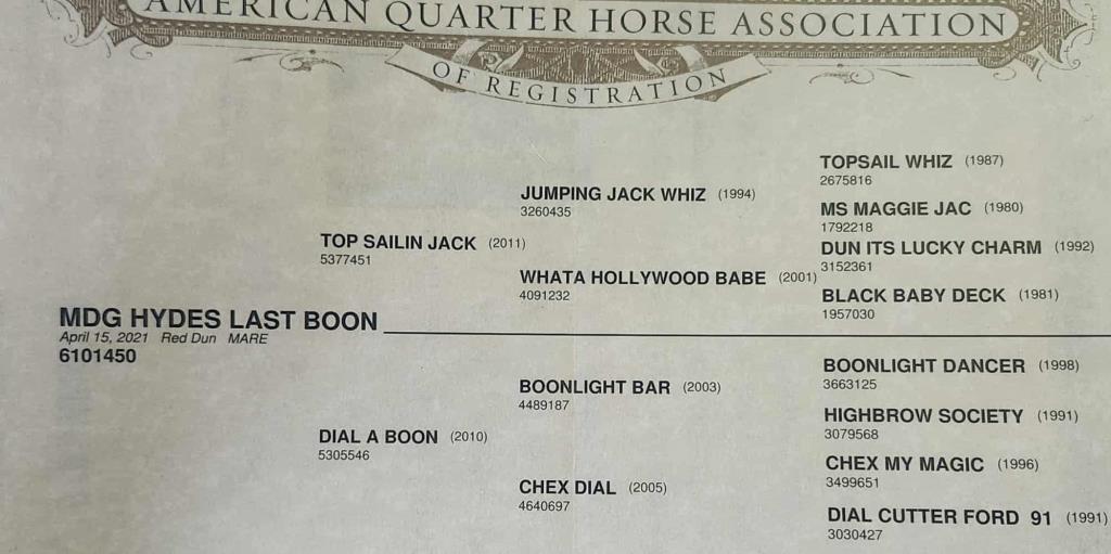 Her dam is a daughter of TOP SAILIN JACK (JUMPING JACK WHIZ X WHATA HOLLYWOOD BABE) Out of a daughter of the great stallion BOONLIGHT BAR (BOONLIGHT DANCER X HIGHBROW SOCIETY)