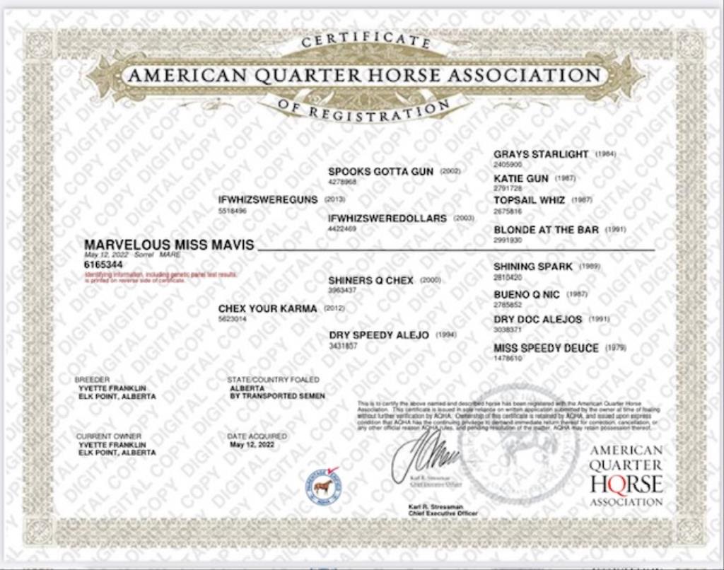 Marvelous Miss Mavis 3-year-old mare: 15 hh: Beautiful, Talented and Ready to Shine Meet Marvelous Miss Mavis - a stunnning 3-year old mare who will turn heads wherever she goes. With her striking looks, thick flowing mane and tail, athletic build, Mavis is as eye-catching as she is capable. Sired by the exciting young stallion Ifwhizswereguns and out of a Shining Spark mare with offspring earnings, Mavis has both the pedigree and potenital to excel in other areas such as ranch riding and rope/breakaway prospect. Professionally trained for 2 years under Amanada Antifaev Mavis is: A big stopper A pretty mover Smooth, responsive, and fun to ride Talented, Athletic, and eager to please She's currently continuing in training with Amanda and progressing in all manoevres. Nominations: NRHA, NRBC, RAPP, TXRS Also eligible for the 4 year old maidan classes Care: Up to date on vaccines, teeth, and farrier, 6 panel negative, Clean X-rays on file Hauling easily arranged anywhere