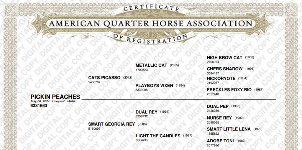 Beautiful 2024 filly sired by Cats Picasso. Dam is a proven cutter, earnings do not reflect talent as she was shown almost exclusivelyy at non-sanctioned events. She ties and hauls, has been handled in a respectful manner, feet trimmed regularily, de-wormed, etc. Has not been spoiled. This filly is very thoughtful and bright. has accepted every new experience well. Brought up right and is ready to move to her next job.