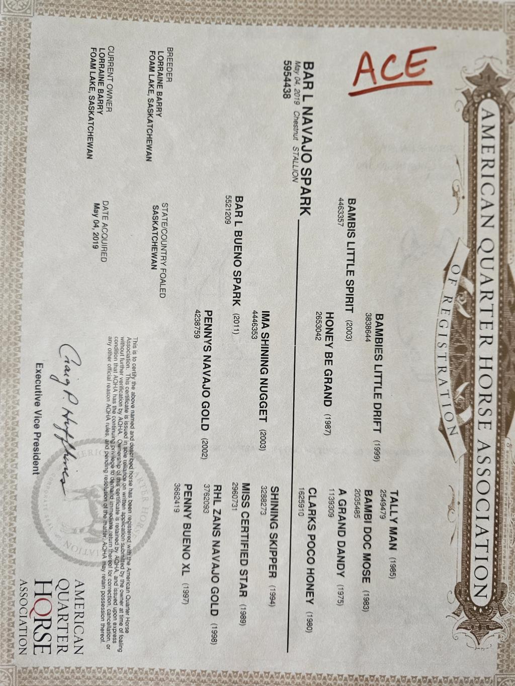 AQHA PAPERS & BLOODLINES Ace’s AQHA papers strongly reflect his personality and work ethic: • Shining Spark / Poco Bueno – smooth movement, athleticism, stamina, and a strong desire to work • Doc Bar / A Grand Dandy – intelligence, quick reactions, sensitivity, and trainability These bloodlines are well known for producing horses that learn quickly, try hard, and excel when given a job, which is exactly who Ace is.