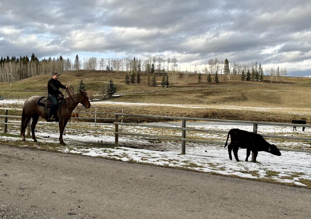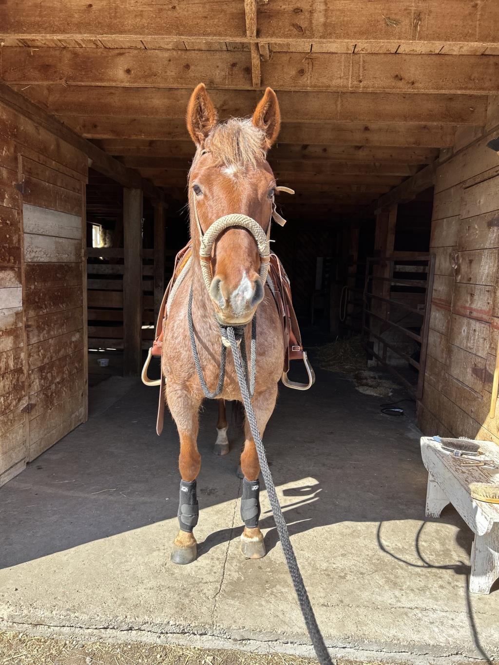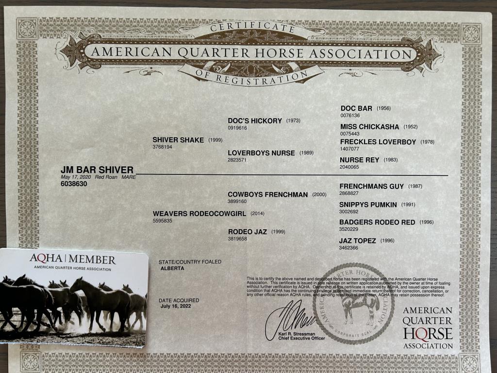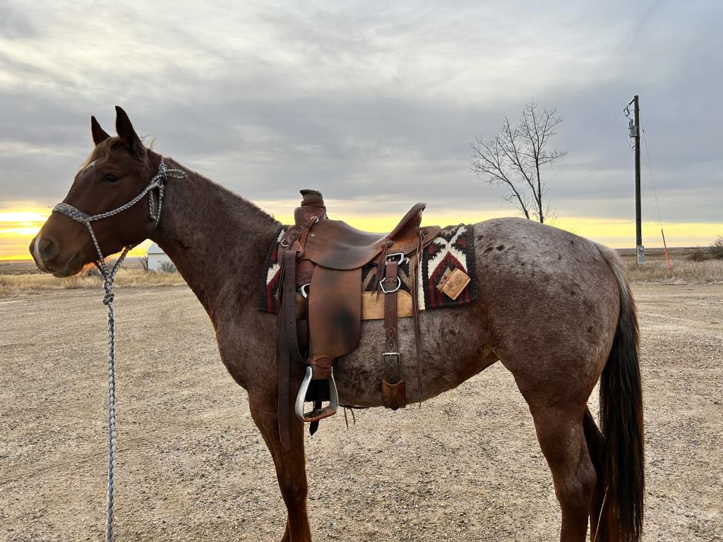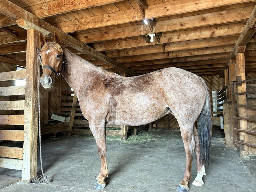 Shiver' is a 5 year old red roan mare standing 15h. She carries cow cross run pedigree. She was started professionally as a 3 year old. We have used her on our ranch sorting and moving cows. Been hauled to a few cow horse clinics the last two years and hauled numerous times to a nearby indoor riding arena. She is an athletic, smart and quick mare. Does very well sorting cows in a pen as she seems to have that cow sense in her. Soft in the bridle and has a real nice stop.