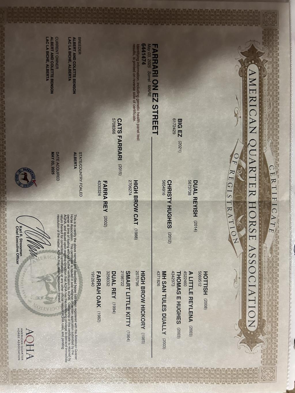 and out of “cats Farrari ”who is an NCHA earner of 8700 and by the great high brow cat out of farra Rey LTE:100,00 & producer of more than 700,000 Should mature to 14.3