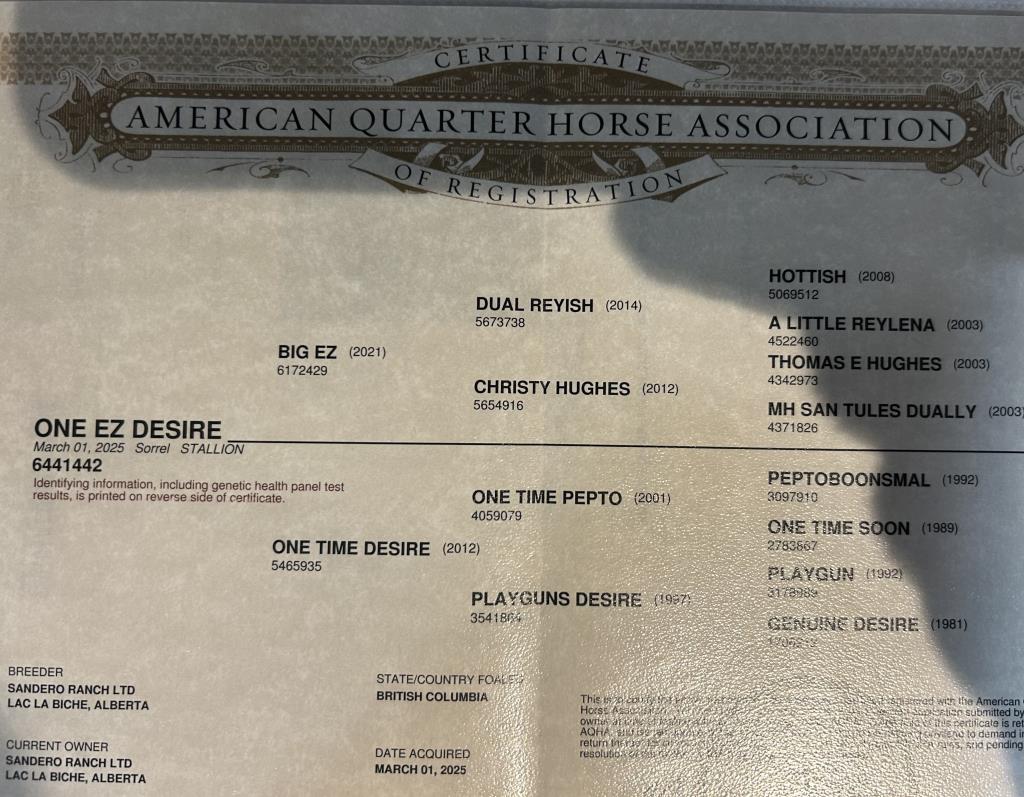 2025 sorrel colt by an own son DUAL REYISH(LTE: $452,687 open futurity champion) this colts loaded with great pedigree full of huge money earners and producers this colts dam won $18,000 and by one time pepto(LTE:331,000) and out of playguns desire(LTE:124,000 PE:881,307)