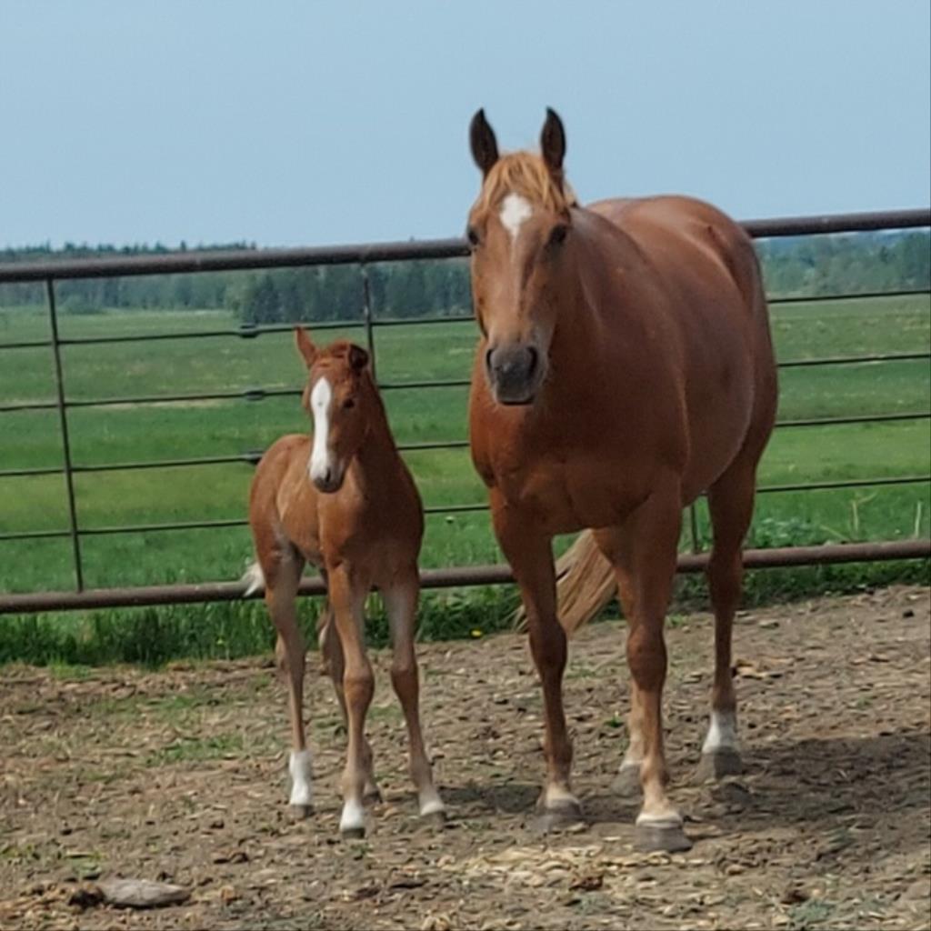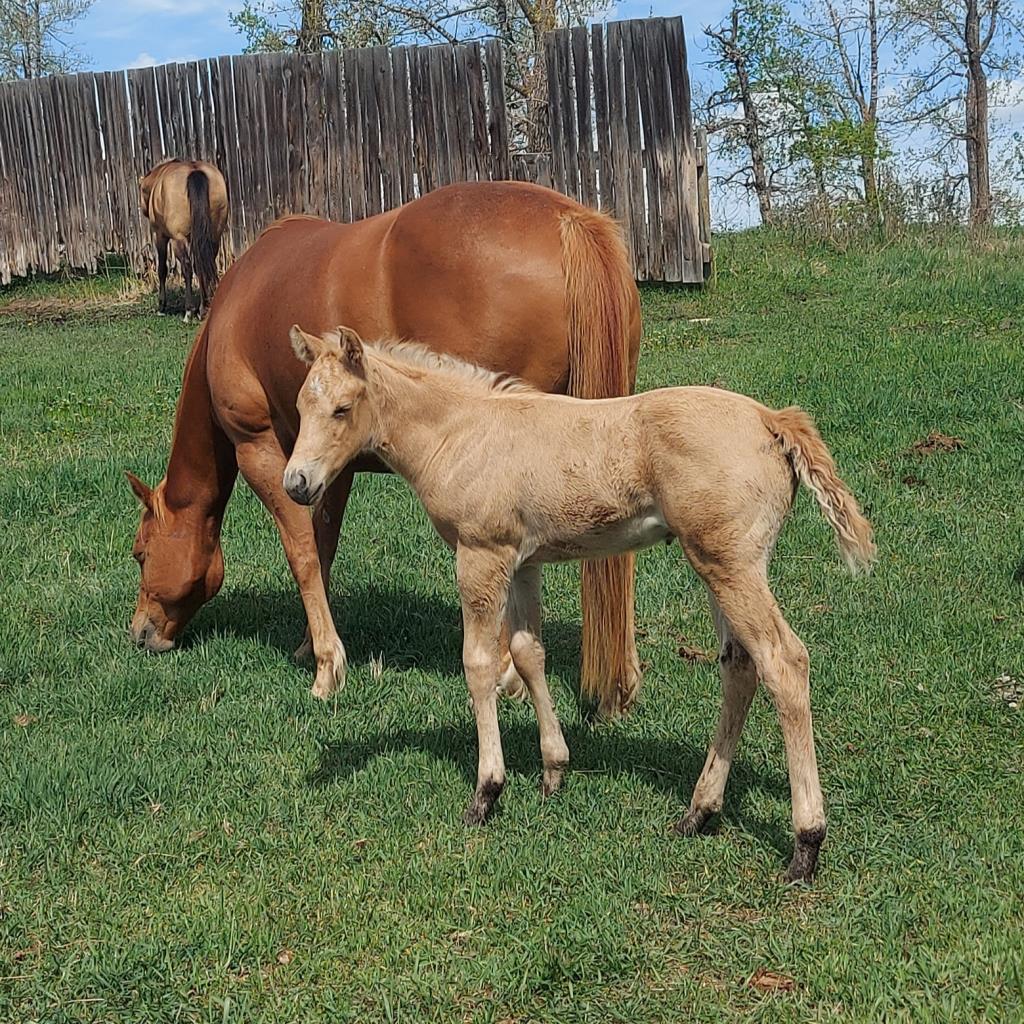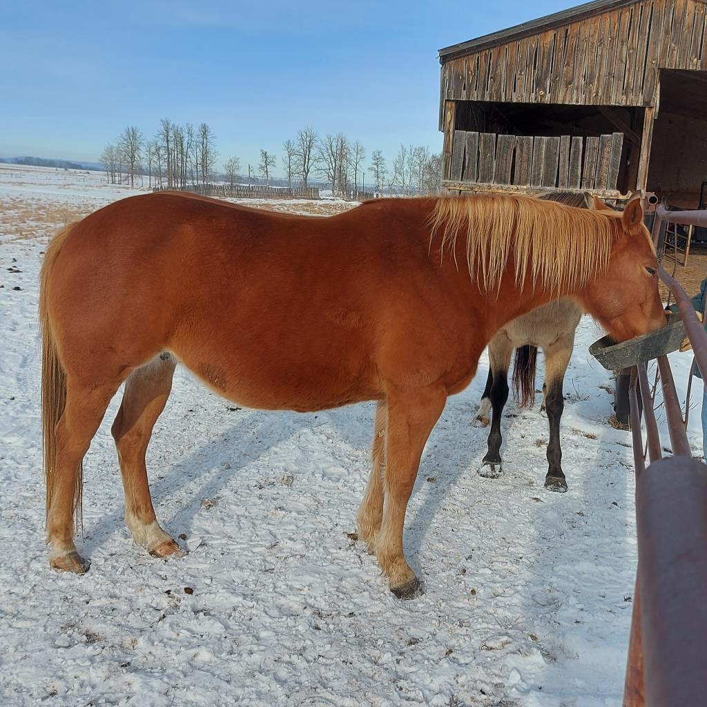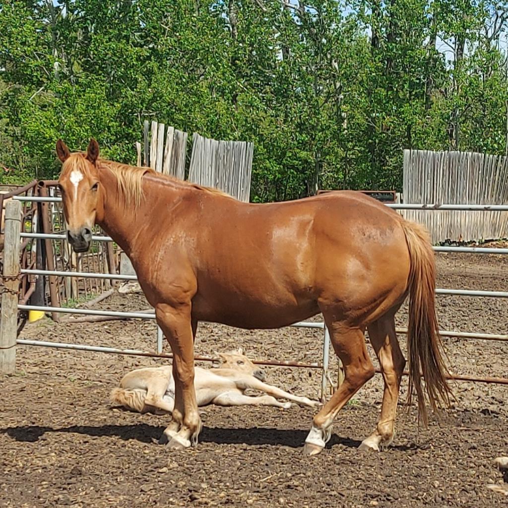 Broodmare with fabulous pedigree. Good mom. Pasture exposed to reining bred palomino stallion for late April. Stands at least 15hh. Condor, Ab.