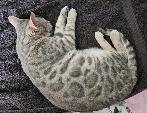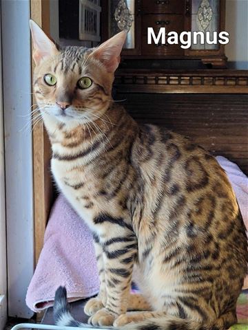 2023 saw big changes in the breeding here. Smudge has retired, Cinnamon was retired and spayed in 2023, and Holly was also spayed. Mel remains in the breeding program for one more year, but Truffle will be retired, and spayed in 2025. So the focus will shift to Magnus, Celeste, and Catalina, as well as Mel, along with Bagheera and Frosty for 2025 only! Frosty and Bagheera are getting old, and are set to be neutered and retred in 2025. So I have recently added a brand new male to the mix, a beautiful blue rosetted male who will be breeding age by the summer of 2025.These cats will produce brown, snow, and silver, as well as charcoal in all three colors, and very limited blue (that won't come until later in the year).