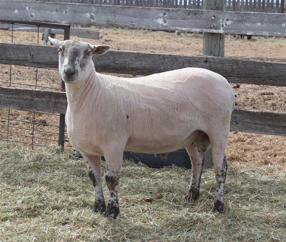 Sheep Trax Hammer 143H is the Sawyer C 4Z son I selected to keep, to be a replacement for his sire. Scrapie genotype QR, this is a ram with great thickness, straight top, excellent bone, and loads of muscle. It didn't hurt at all to hold onto this guy. Just a year old in September of 2021, this ram was nearly as big as the yearlings and mature rams he lived with. The Sawyer genetics are strong in this one, as his dam's grandsire was also a Sawyer ram. Because he was heavily used for the 2023 lambing, he was used only lightly for 2024, and will have a couple of fall-born daughters in the Badlands Spring Select in May 2025. He has two yearling sons from January 2024; Milo 424M also sells in the Badlands Spring select, and Magnum 403M has been entered in the All Canada Classic in Brandon, MB in July. The 403M ram is one of the best rams I have ever offered in a Classic. Hammer 143H was used last summer and has 16 lambs on the ground in the Jan-Feb 2025 lamb crop. Naturally, as soon as they had 100-day weights, his GenOvis numbers began to rise.