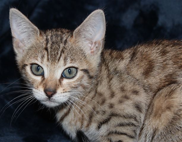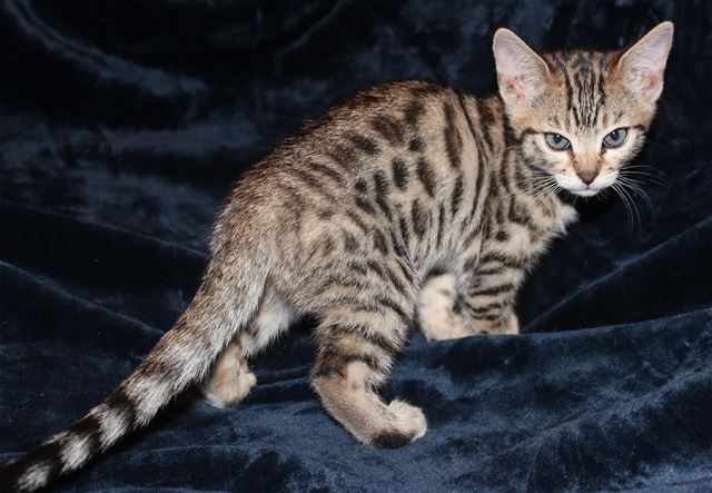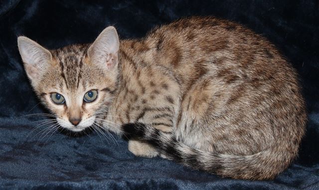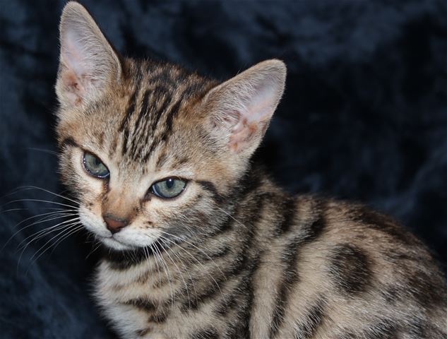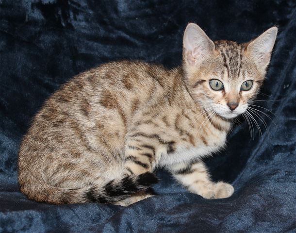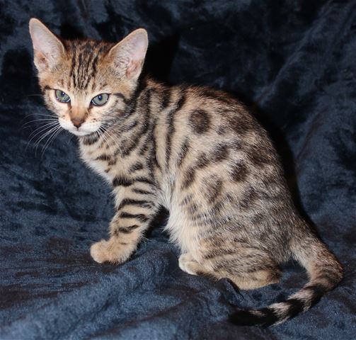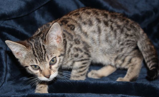This is the biggest, fattest kitten in the litter. She has a grumpy face (courtesy of her great-grandmother Cinnamon, who has the best resting b*tch face I have ever seen), but she is very sweet, adventurous, playful, charming, everything you would want in a Bengal kitten. The photos were taken Feb. 3, and she is still in her fuzzies, so new photos need to be taken in another couple of weeks when the fuzzies fade. She is fairly light brown right now but is turning more coppery as she ages. She has arrowhead rosettes, and is going to look remarkably like her grandmother Truffle. Because she is Truffle's grandbaby, she will probably be a "grabby tabby", taking a swipe at your ankles once in a while just to let you know she wants attention!