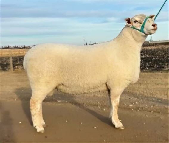 Lots of breed character, sired by my main flock sire who traces to Bennachie Nimrod, a British ram that worked very well for me. The dam is sired by Tattykeel 80/97 an older Australian line, who in my opinion has more maternal than a lot of the more modern Austalain Polled Dorsets. I like the combination of British on the 80/97 daughters. Scrapie genotype RR.
