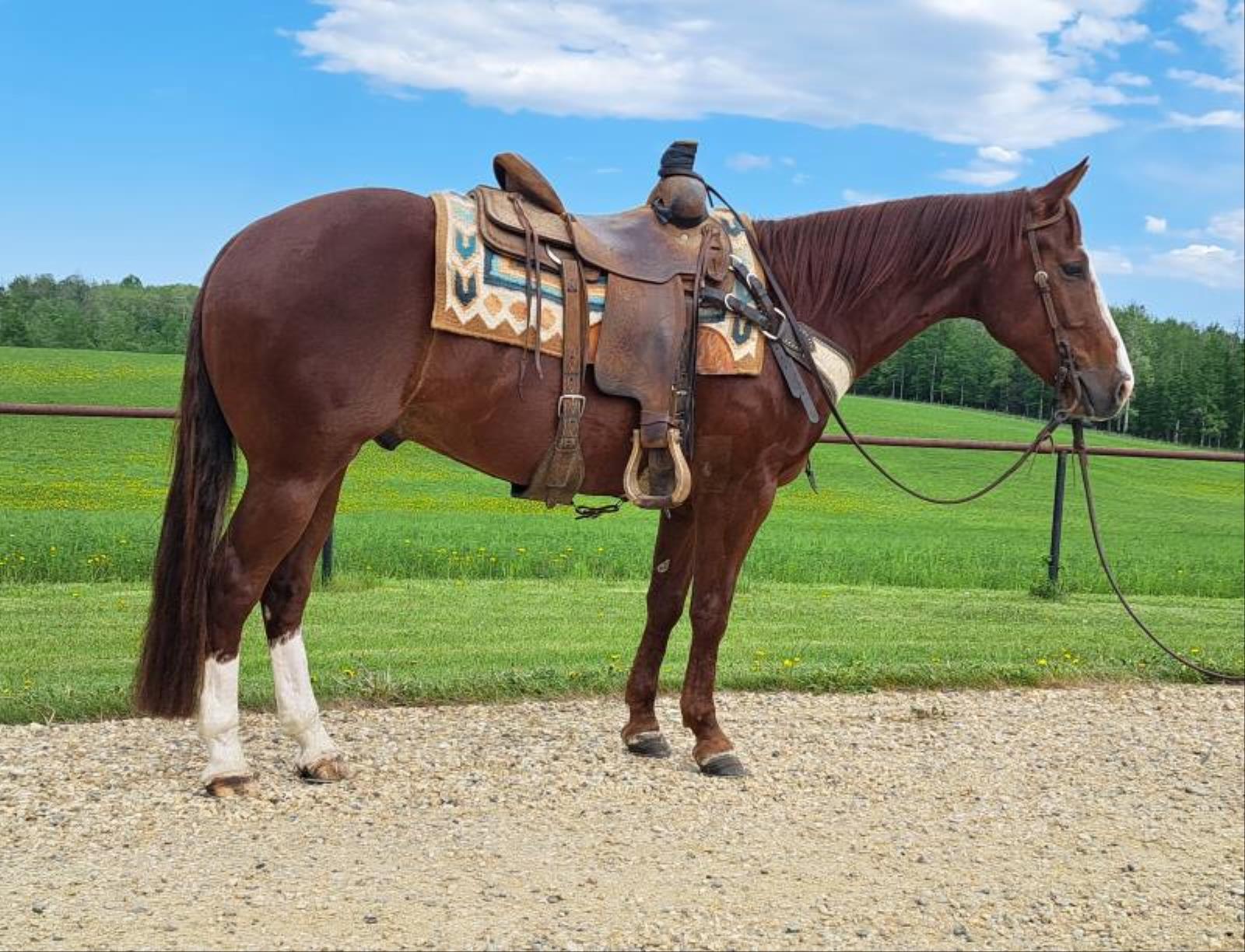 3-year-old AQHA prospect with a great start, confirmation, pedigree and eligible for a long list of the best incentives in Canada! Started last summer with the majority of the winter off, coming back into the working string without a blink, taking off exactly where he left off last fall. Sired by Red Hott Cat (Metallic Cat) out of a Boonlight Dancer mare. He is currently started on the roping dummy and mechanical flag, and will be started on live cattle soon! He has been doing some ranch work this spring and has also been hauled to the lastest Cowhorse competitions to turn back. He takes the horse show environment with ease. He is a good minded, solid prospect with a lineup of incentives that we are proud to offer! Eligible for: Royal Crown Canada, The Breeders Elite Roping Incentive, Alberta Reined Cow Horse Association Futurity Incentive, Alberta Stock Horse Association Futurity Incentive, Canadian Barrel Horse Incentive and Saskatchewan Reined Cowhorse Association Futurity Incentive. Located 10 minutes north west of Rimbey. For more information please contact John @ 780-216-2000>