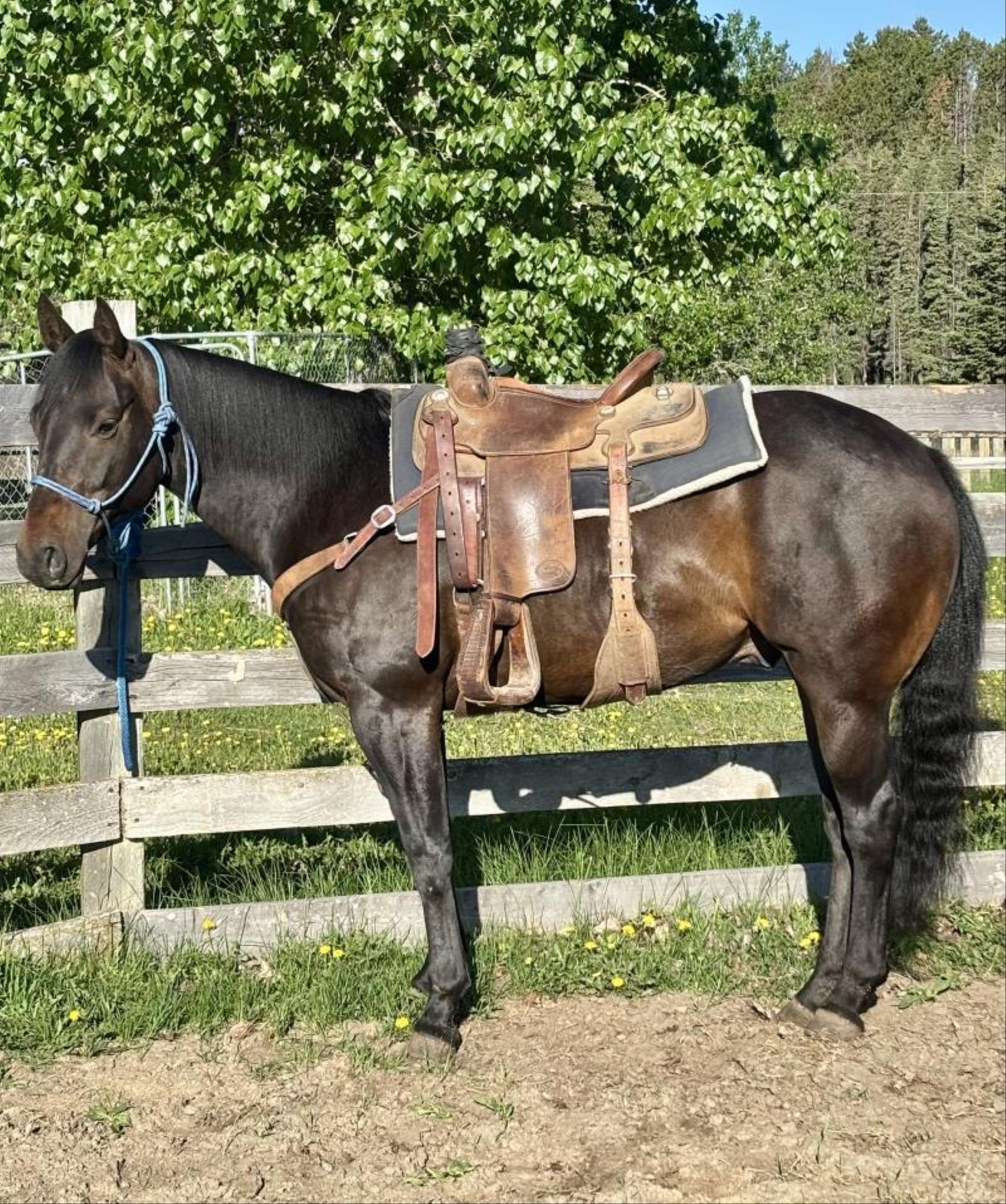 Chocolate, is as sweet as candy. He is 14’3 and home raised. His sire is a proven rope horse producer with lots of run and cow sense. His dam is by a World Champion calf horse BCS Silver Doc, who we owned and crossed with Cowboy Gun. This gelding has endless possibilities in the rope pen. For more info please call Will at (780) 898-5670