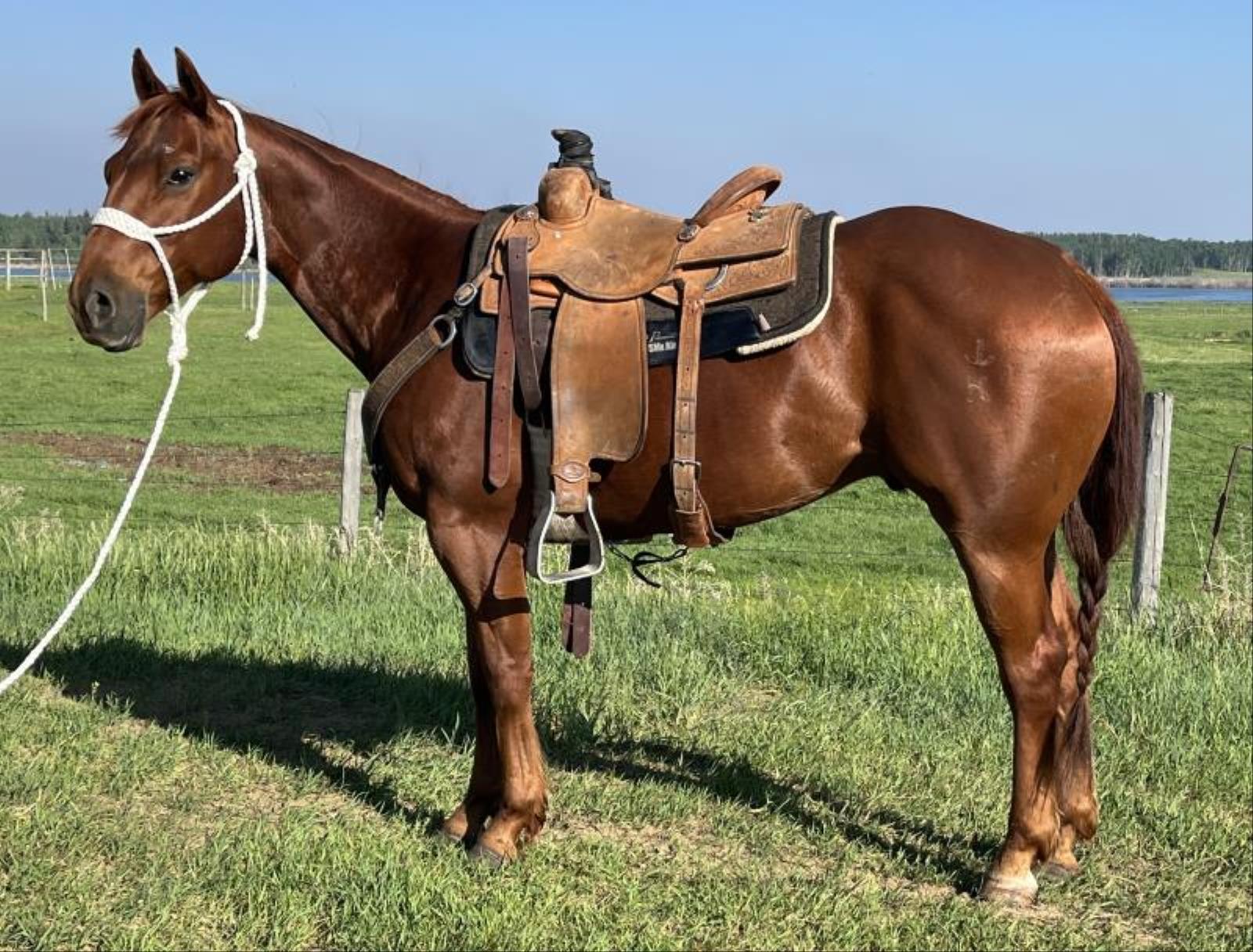 SID is an eight year old grade, sorrel gelding with a good foundation on the heel side, and has been hauled around to jackpots. He is started in the breakaway and has tied down a few calves as well. SID stands 14.3 HH and is a thick solid build, and we’ll put together. SID has been used sorting and doctoring cattle in the pasture and on the farm, as well as drug calves to the fire. SID has seen the miles in and out of the arena, he is very athletic and ready to go in any direction you might be looking to go. Reach out if you like more information or have questions about the directions he could go.